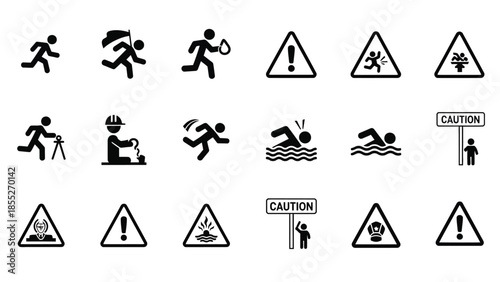 safety, signs, pictogram, warning, hazard, caution, danger, triangle, exclamation, person, running, falling, construction, hard hat, swimming, water, wave, lifeguard, alert, attention, risk, symbol, black-and-white, vector, icon, illustration, emergency, prevention, protection, compliance, regulation, guidance, awareness, identification, notification, signal, notice, instruction, precaution, obstacle, equipment, area, prohibited, mandatory, information, security, environment, health care