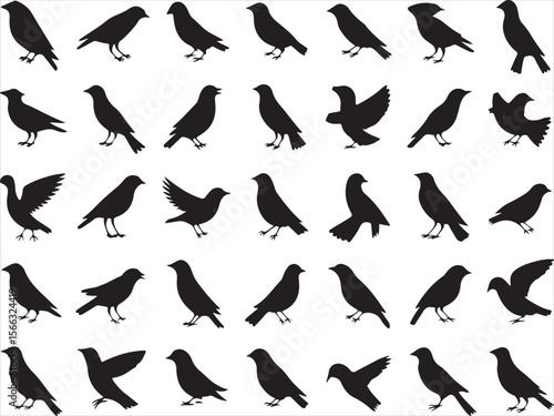 Collection of black bird silhouettes in various poses on a white background