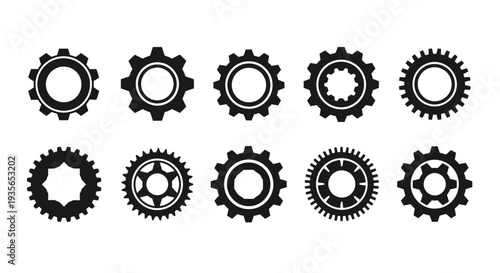 Collection of black gear icons arranged in a horizontal and vertical pattern silhouette