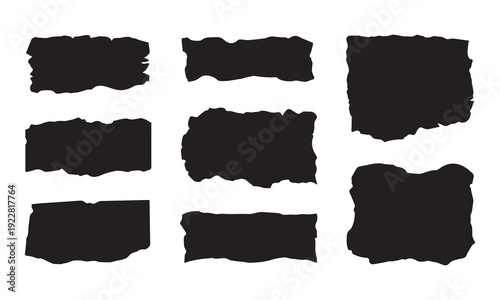 Collection of black irregular shapes with torn edges, resembling torn paper or grunge textures, isolated on white.