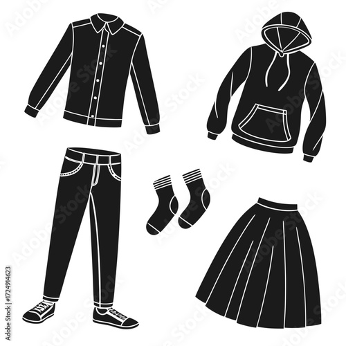 Collection of black silhouette clothing items including a collared shirt jeans with sneakers socks a hoodie and a pleated skirt on a white background