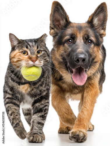cat, dog, pet, animal, playful, running, playing, ball, motion, isolated, white background, cute, domestic, felino, canino, active, lively, happy, friends, companion, mammal, friendship, together, exciting, paw, fur, tail, jump, leaping, interactive, entertainment, adorable, energetic, chase, joyful, dynamic, enthusiastic, agile, speed, agility, fun, frolic, game, activity, exercise, sprinting, frisky, amusing