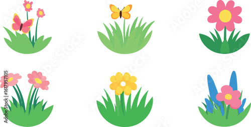 Collection of colorful cartoon flowers and butterflies in green grass patches