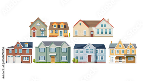 Collection of colorful houses, representing real estate, family living, and suburban architecture