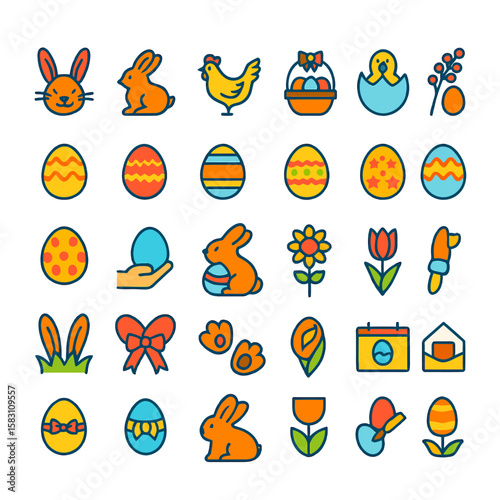 Collection of colorful line art Easter icons, featuring rabbits, chickens, eggs, flowers, and other Easter-themed symbols.