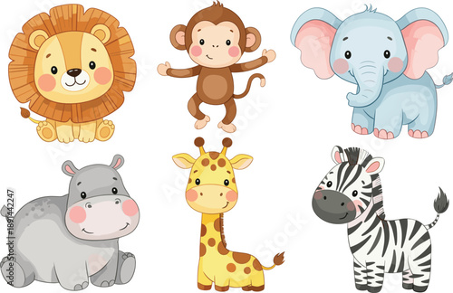 Collection of cute baby safari animals and jungle characters isolated on white background for nursery.