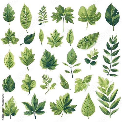 Collection of different types of green leaves arranged. Various shapes and shades of green leaves neatly displayed showing diversity in plant leaf structure and form.
