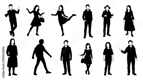 people, silhouette, black, figure, group, vector, isolated, standing, walking, dancing, posing, fashion, clothing, style, woman, man, adult, individual, graphic, design, illustration, artwork, minimalist, modern, contemporary, abstract, shape, form, representation, portrait, dynamic, movement, diversity, collection, lifestyle, urban, casual attire, elegant, stylish, activity, public, shadow, profile, imagery, creative, digital, art