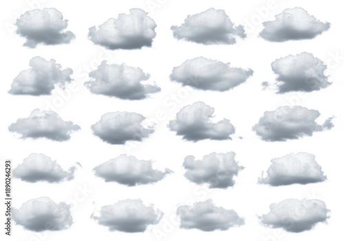 Collection of diverse fluffy cumulus cloud formations on a white background