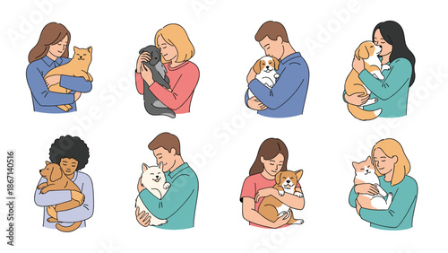 pet, people, hugging, love, affection, dog, cat, animal, friendship, care, diversity, happiness, canino, felino, domestic, bond, togetherness, lifestyle, loyalty, companionship, emotional, joy, heartwarming, illustration, character, man, woman, set, collection, diverse, caring, human relationships, support, comfort, kindness, peace, home, family, puppy, kitten, vet