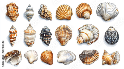 Collection of diverse seashells showcasing various patterns and colors, perfect for beach-themed designs or marine projects.