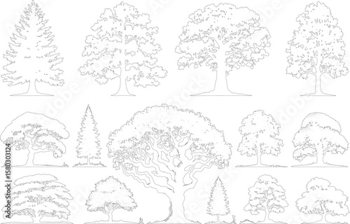 Collection of diverse tree outlines and sketches in a clean white background illustration