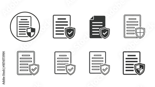 document, shield, security, protection, icon, set, contract, agreements, verification, datum, insurance, privacy, guarantee, checklist, safety, legal, certified, approved, secure, glyphs, outline, filled, black, white, symbol, emblem, seal, safeguard, access, control, digital, policy, record, paper, regulation, compliance, trust, securement, business