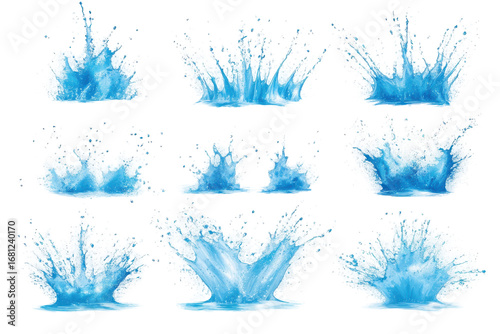 Collection of dynamic blue water splashes isolated on transparent background. Collection set of blue water splashing isolated on white background.