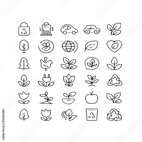 Collection of eco friendly and sustainable icons featuring plants vehicles and recycling symbols in black