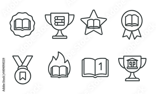 education, icon, book, trophy, academic, achievement, award, learning, reading, medal, design, concept, school, study, cognition, success, badge, certification, star, fire, outline, illustration, minimal, symbol, black, white, element, vector