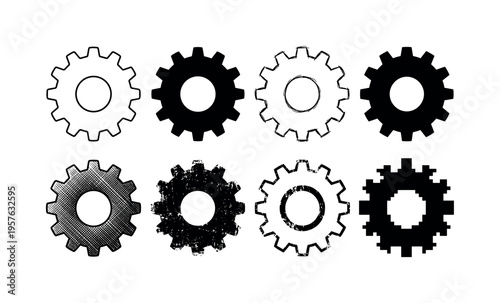 gear, cogwheel, mechanical, industry, engineering, machinery, technology, mechanism, part, component, set, collection, icon, symbol, design, graphic, illustration, vector, outline, solid, black-and-white, monochrome, vignetting, hand-drawn, distressed, grunge, textured, hatch, crosshatch, pixelated, digital, abstract, concept, idea, process, work, automation, power, movement, rotation, drive, system, network, connection, teamwork, collaboration, innovation, progress, development