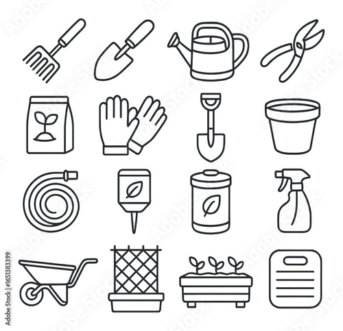 gardening, tool, icon, grey, background, rake, trowel, watering, can, pruners, glove, shovel, pot, hose, fertilizer, spray, bottle, wheelbarrow, fence, planter, compost, spade, equipment, supply, symbol, monochrome, outline, vector, garden, design, utility, essential, plant, care, cultivation, horticulture, landscaping, agriculture, minimal