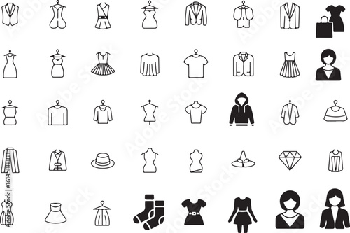 fashion, apparel, clothing, icon, vector, dress, shirt, jacket, pant, skirt, hat, shoe, sock, mannequin, hanger, shopping bag, diamond, blouse, sweater, hoodie, suit, attaching, woman, fashion design, retail, style, garment, accessory, clothes rack, illustration, clip art