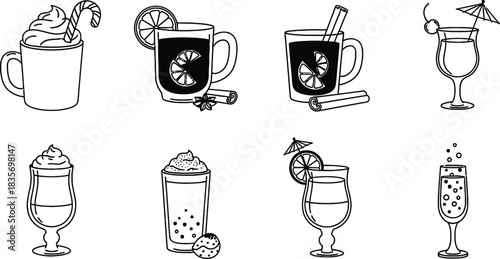 drink, beverage, holiday, festive, collection, illustration, hot, cold, sweet, cocktail, mug, glasses, cinnamon, orange, candy, cane, umbrella, cherry, bubble, dessert, winter, seasonal, celebration, warm, refreshing, garnish, treat, party, design, graphic, simple, decorative, outline, set