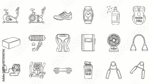 fitness, sport, equipment, icon, exercise, gym, physical exercise, health, lifestyle, training, running, weightlift, cardio, strength, accessory, line art, vector, illustration, set, collection, design, graphic, element, symbol, outline, clean, modern, simple, minimalist, activity, activewear, water bottle, treadmill, elliptical, aerobic, wellness, active