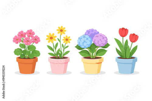 potted, flower, plant, gardening, illustration, spring, summer, floral, decoration, botanical, nature, growth, bloom, geranium, daisy, hydrangea, tulip, container, vibrant, colourful, domestic