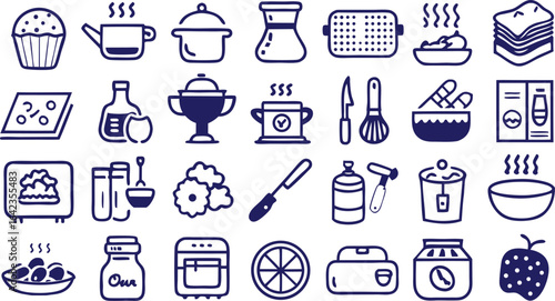 Collection of Hand Drawn Kitchen and Food Icons in Blue Outline cupcake teapot