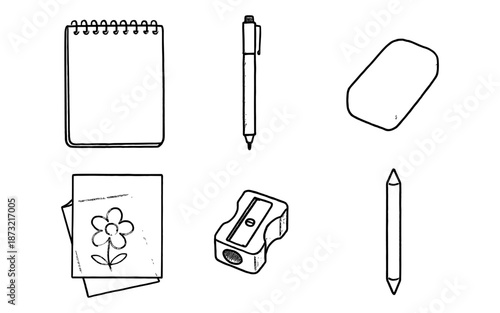 stationery, school supplies, art supply, drawing, notebook, pen, crayons, eraser, sharpener, paper, illustration, hand-drawn, vignetting, doodle, back to school, education, office supply, writing, creative, design, icon, set, collection, minimalist, outline, simple, white background, isolated, object, tool, learning, childhood, artistic, craft, element
