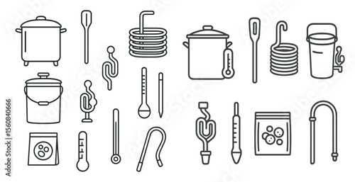 Collection of kitchen utensils and tools, including a thermometer, a pot, and a spoon