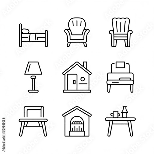 home, furniture, icon, line art, bed, chair, table, lamp, house, decor, interior design, simple icons, clip art, rocking chair, armchair, coffee table, fireplace, home decor