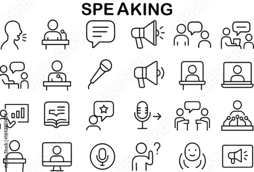 speaking, speech, communication, presentation, icon, icon, set, collection, vector, illustration, outline, drawing, line art, symbol, design, graphic, speaker, microphone, dialogue, chat, meeting, conference, seminar, lecture, audience, business, education, information, message, announcement, broadcasting, media, voice, sound, discussion, people, figure