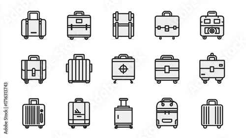 Collection of luggage icons showing various types of suitcases bags and briefcases for travel and business
