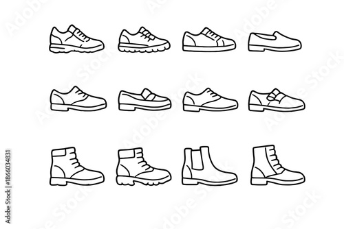 footwear, shoe, icon, collection, sneaker, boot, loafers, fashion, apparel, clothing, accessory, set, graphic, outline, minimalist, casual attire, formal, leather, lace, sole, line art, white