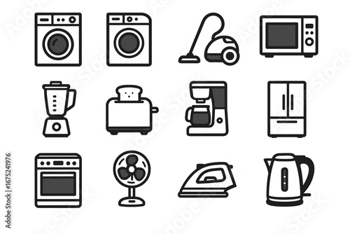 appliance, icon, household, collection, modern, washing, vacuum, microwave, blender, toaster, hot drink, refrigerator, oven, fan, iron, kettle, kitchen, electric, device, outline, style, simple, domestic, equipment, home, minimalist, electronic, contraption, tool, machine, symbol, graphic, clean, vector, icon