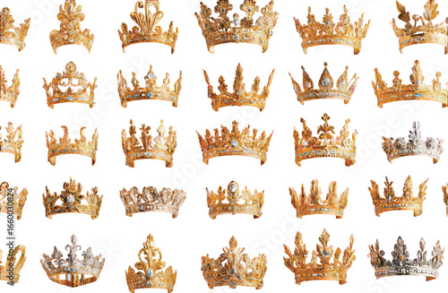 crown, tiara, royals, gold, gold, ornate, gem, regal, vintage, antique, luxury, treasure, royalty, monarch, queen, king, princess, prince, imperial, majestic, precious, valuable, decorative, ceremonial, headdress, headwear, accessory, jewellery, precious stone, gem, diamond, pearl, elaborate, detailed, intricate, classic, elegant, sophisticated, opulent, rich, historical, traditional, isolated, white background, collection, set