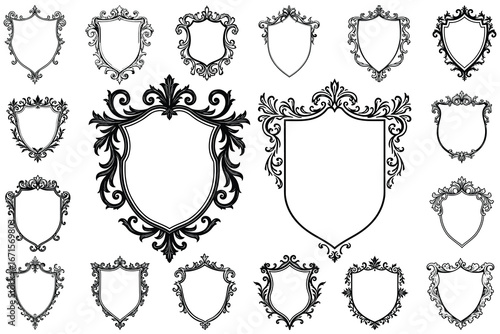 Collection of ornate shield frames and decorative elements