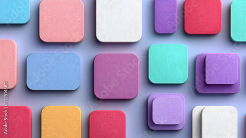 Collection of pastel-colored square shapes arranged on a light purple background.