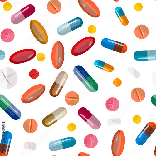 Collection of pills and capsules. Seamless colorful medication. Vector