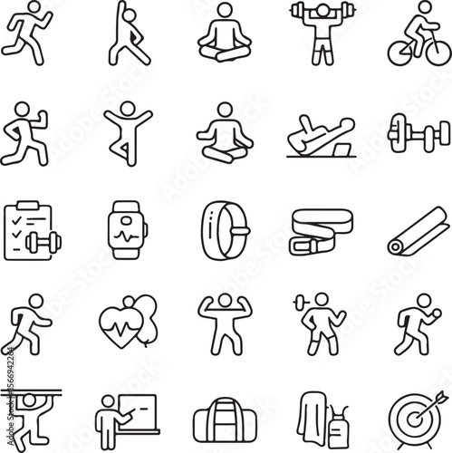 fitness, health, icon, line, art, vector, running, yoga, meditation, weightlift, cycling, exercise, physical exercise, gym, sport, healthy, lifestyle, activity, cardio, strength, training, balance, mindfulness, wellness, bodybuilding, dumbbell, weight, plate, clipboard, checklist, tracker, resistance, band, mat, heartbeat, pulse, muscle, bicep, pull, up, barbell, teacher, presentation, bag, towel