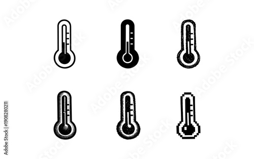 Collection of six different thermometer icons in black and white, representing various styles and textures