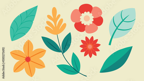Collection of stylized floral elements and leaves