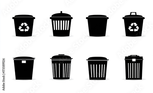 Collection of various black and white recycling and trash receptacles, presented in a simple and modern icon design.