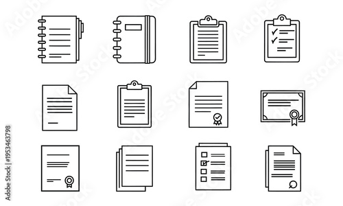 Collection of various document and clipboard icons in line art style