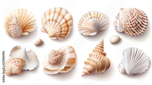 shell, seashell, ocean, beach, sea, summer, coast, collection, nature, oceanic, marin, coastal, tropical, vacation, holiday, travel, sand, water, coral, mollusc, bivalve, spiral, texture, pattern, design, element, isolated, white, background, illustration, realistic, set, group, variety, closeup, detailed, photo, image, graphic, art