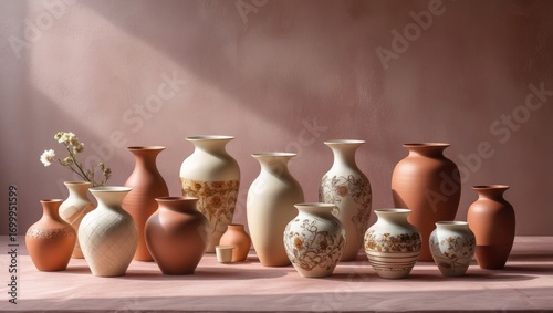 vase, ceramic, flower, decorative, terracotta, pottery, home decor, art, still life, arrangement, table, indoor, collection, design, craft, hand-made, studio, display, minimalist, elegant, vintage, rustic, neutral, earthy, floral, pattern, texture, shadow, light, composition, style, artwork, interior, decoration, tabletop, studio shot, craftsmanship, ornament, object, clay, beige, brown, white, pink, surface, background, group, variety, vase