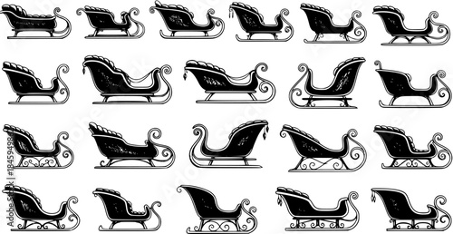 holiday, sleigh, santa, christmas, winter, holiday, sled, vintage, retro, classic, antique, traditional, elegant, ornate, detailed, decorative, fancy, engraved, vignetting, drawing, hand-drawn, black, white, silhouette, outline, graphic, vector, illustration, icon, set, collection, assortment, variety, transport, travel, ride, snow, magic, festive, celebration, december, season, joyful, merry, old, scrollwork, fairy tale, jingle, rustic