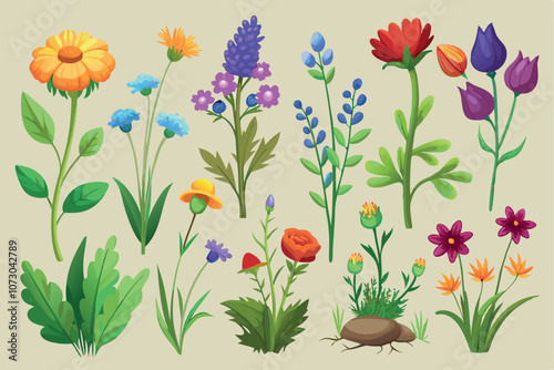 Collection of wildflowers, set, clipart, design game asset sprite sheet, aquarelle illustration, of hand drawn plants, leaves, flowers. Silhouettes of natural elements for seasonal backgrounds, and ve