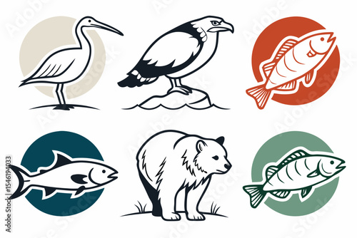 heron, eagle, fish, bear, animal, wildlife, nature, illustration, drawing, icon, symbol, graphic, design, clip art, isolated, outline, set, collection, species, fauna, cartoon, badge, logotype, element, art, shape