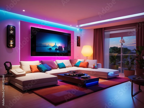 Colored LED lighting home cinema living room interior Design.