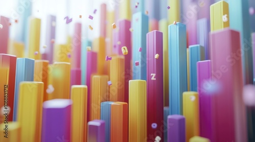 Colorful 3D bar graph with floating elements, representing data visualization and analysis.